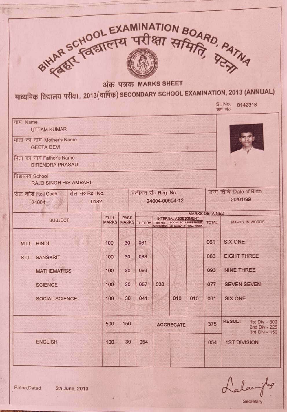 | Exam | Full Marks | Pass Marks | Marks Obtained |