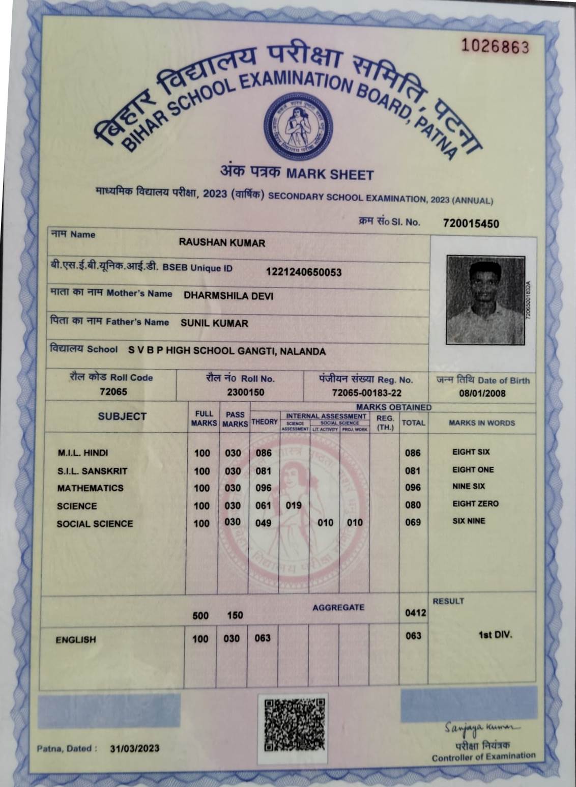 | Exam | Full Marks | Pass Marks | Marks Obtained |