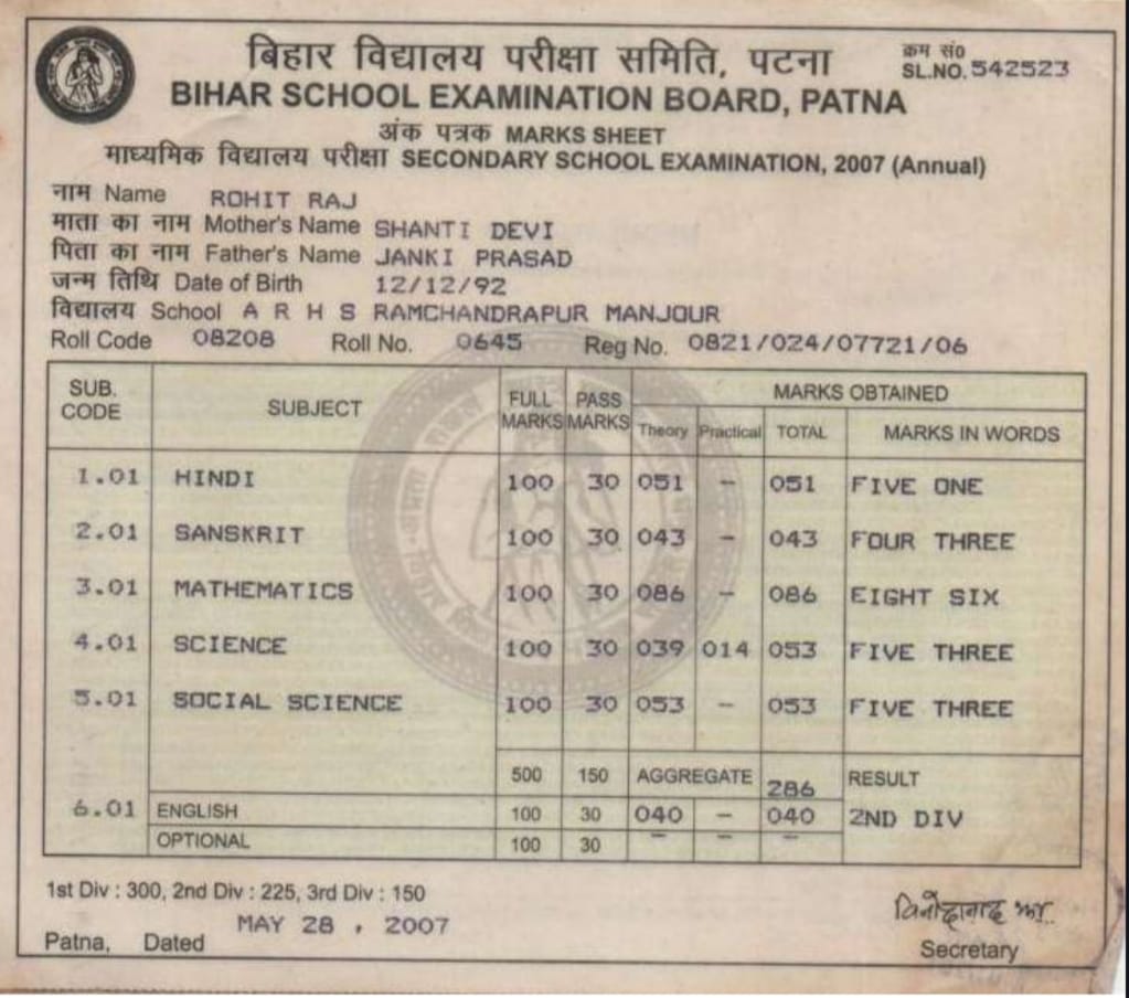 | Exam | Full Marks | Pass Marks | Marks Obtained |