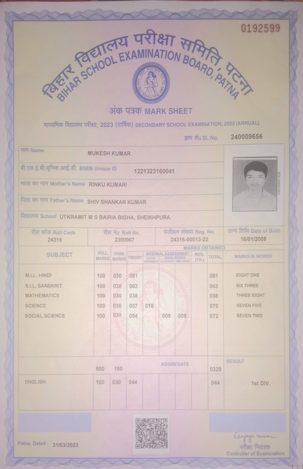 | Exam | Full Marks | Pass Marks | Marks Obtained |