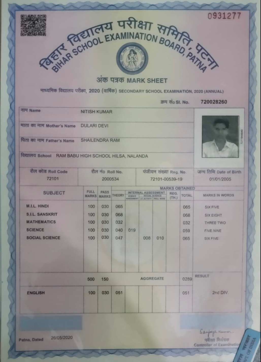 | Exam | Full Marks | Pass Marks | Marks Obtained |