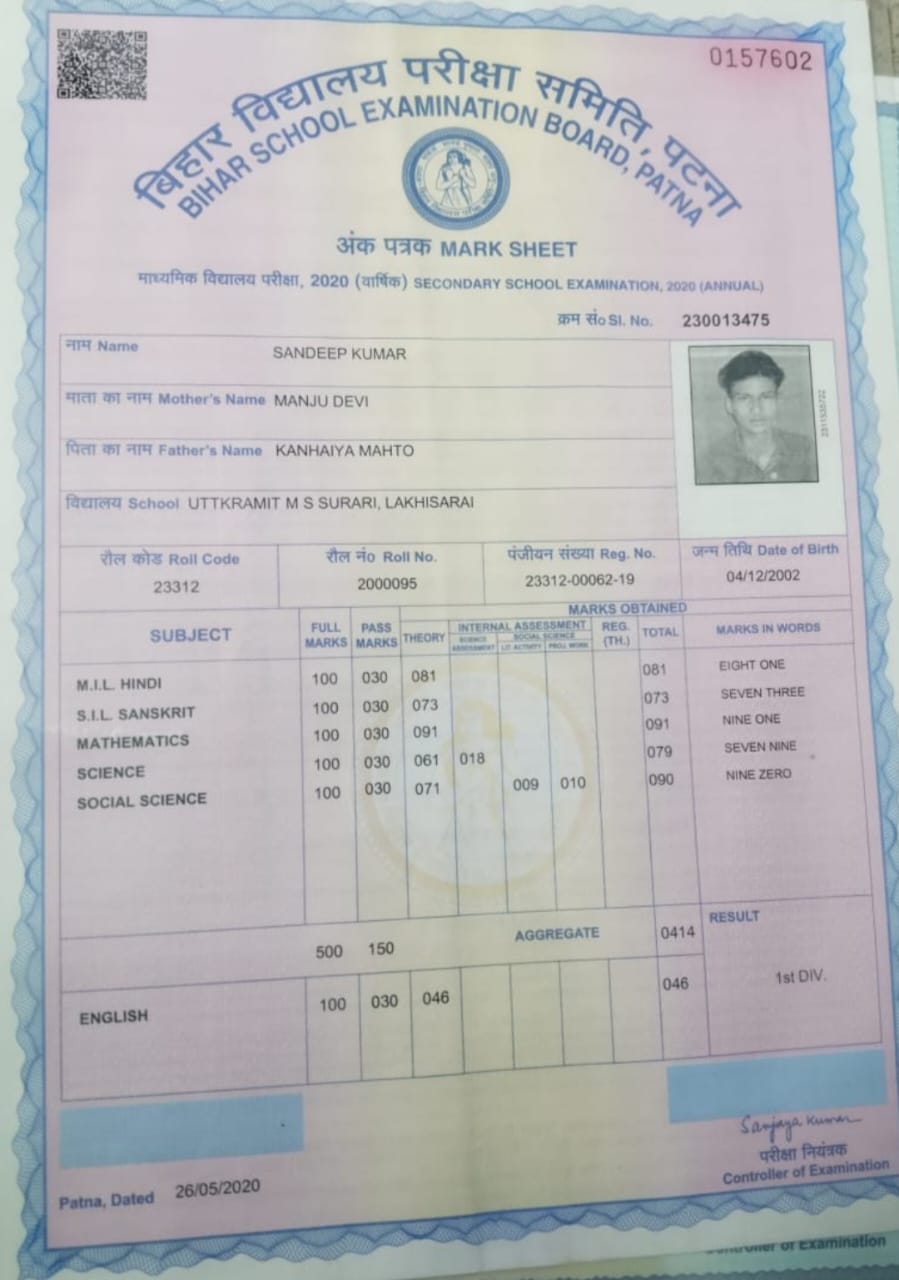| Exam | Full Marks | Pass Marks | Marks Obtained |