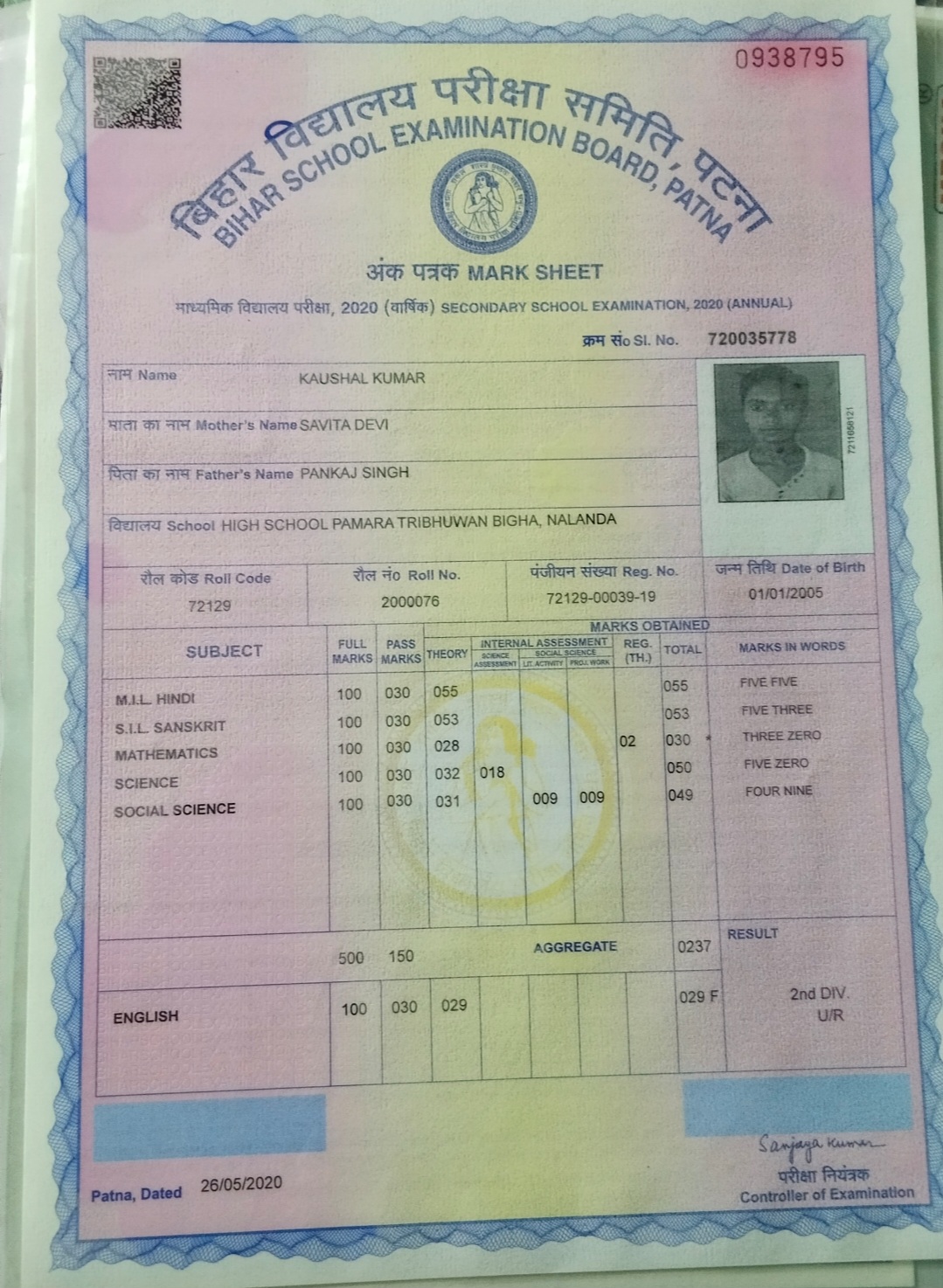 | Exam | Full Marks | Pass Marks | Marks Obtained |
