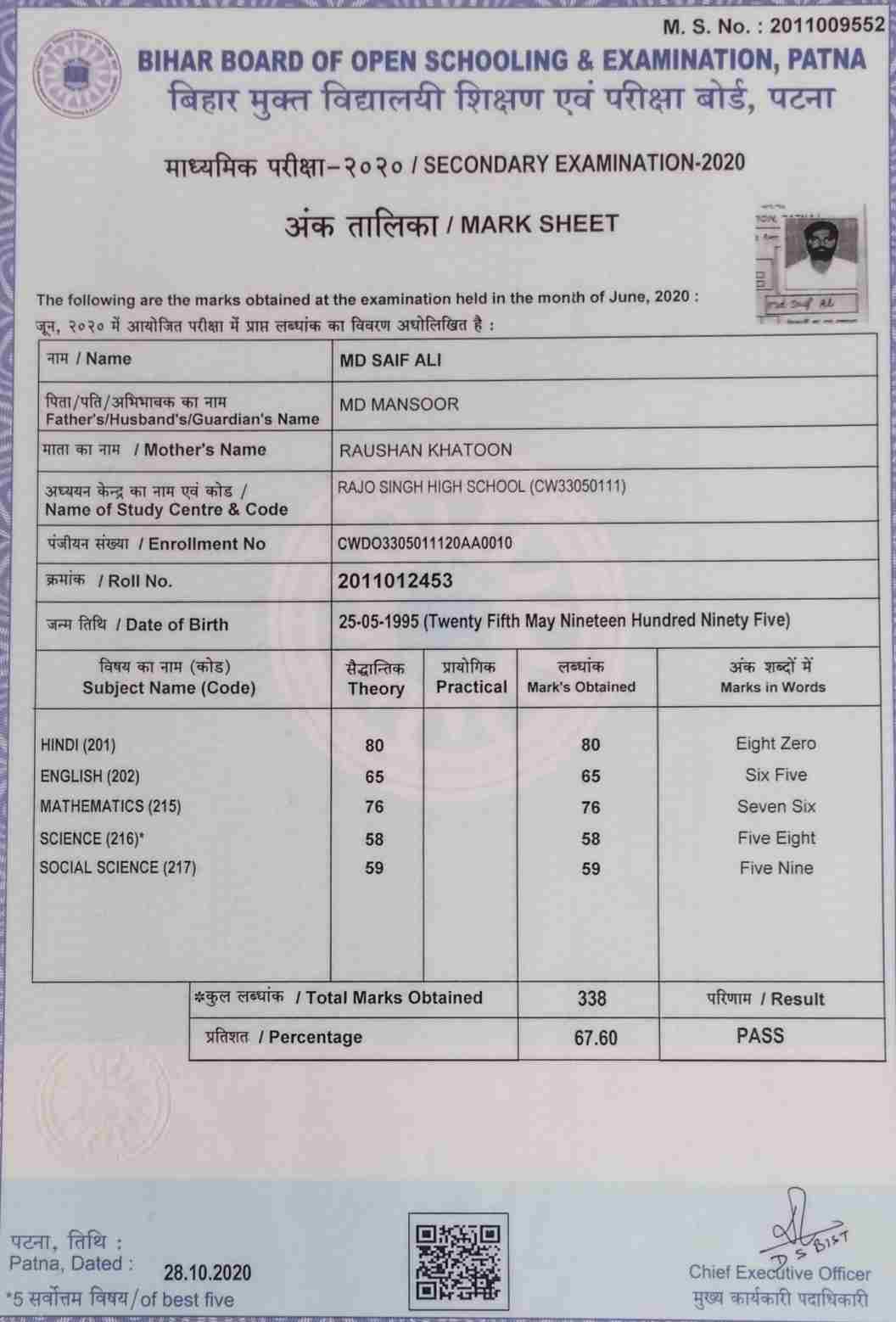 | Exam | Full Marks | Pass Marks | Marks Obtained |