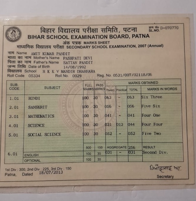 | Exam | Full Marks | Pass Marks | Marks Obtained |